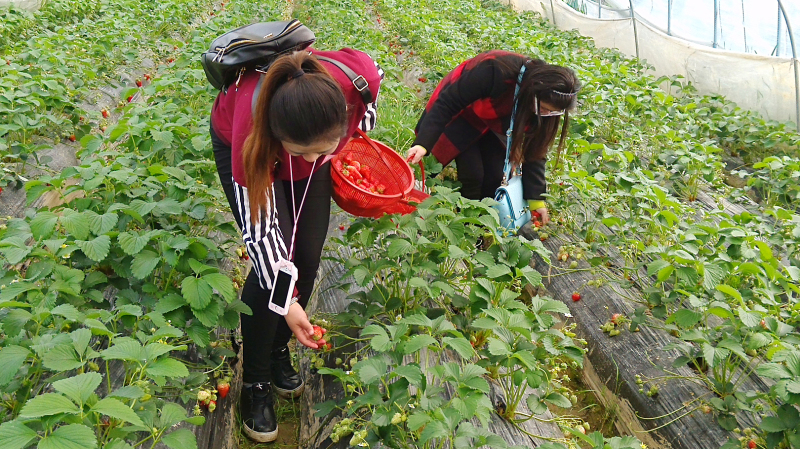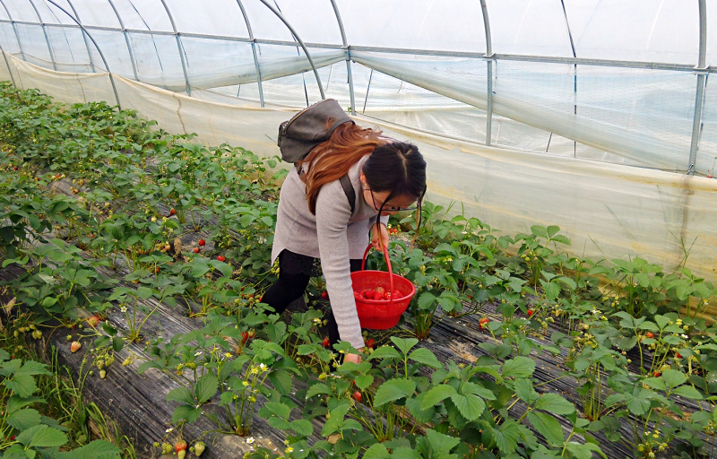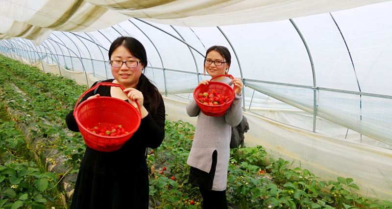 飯后經(jīng)過(guò)短暫的一番休息、調整,大家乘車(chē)向草莓園出發(fā)前進(jìn)!車(chē)剛停穩,大家便迫不及待地下車(chē),映入眼簾的便是一排排整齊的草莓大棚。領(lǐng)了籃子,在工作人員的安排帶領(lǐng)下,我們一行人進(jìn)入到草莓大棚里——綠油油的草莓地里,點(diǎn)綴著(zhù)紅彤彤的草莓果,一顆顆翠艷欲滴,令人食指大動(dòng)!